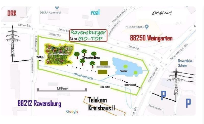 Nachdem die vier Gebäude/Wohn-Container der Unterkunft für Asylbewerber in der Schützenstrasse 106 (Ravensburg) abgerissen respektive entfernt waren, hatte ich den drei hiesigen Bürgermeistern und dem Landratsamt im Jahr 2019 den Vorschlag unterbreitet, dort das eigentlich schon in Grundzügen bestehende Biotop qualitativ, klimafördernd und als Bürgeroase zu gestalten und zu optimieren.