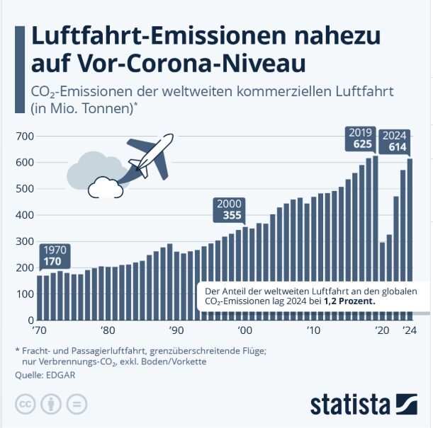 Der Anteil der weltweiten Luftfahrt an den globalen CO₂-Emissionen liegt den EU-Daten zufolge im Jahr 2024 bei 1,2 Prozent. Das Deutsche Zentrum für Luft- und Raumfahrt (DLR) weist in diesem Zusammenhang darauf hin, dass nur ein Drittel der Klimawirkung des Luftverkehrs auf CO2-Emissionen entfällt. Die anderen zwei Drittel der Klimawirkung des Luftverkehrs seien auf Nicht-CO2-Effekte zurückzuführen. Kondensstreifen und daraus resultierende Kondensstreifen-Zirren seien dabei der bedeutendste Faktor.