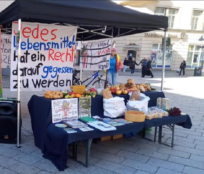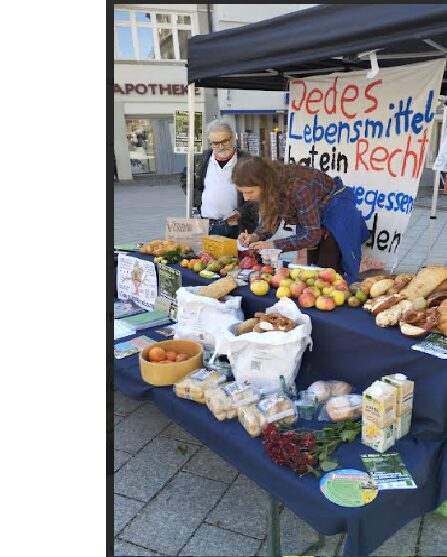 Dort nämlich waren Brote, Brezen, Äpfel, Paprika, Kartoffeln, Blumen, Berliner, Milch im Tetrapack und weitere haltbare und genießbare Nahrungsmittel ausgelegt. Gespendet worden waren sie am Morgen von Supermärkten, die diese Waren nicht mehr verkaufen konnten. Nicht weil sie etwas verdorben waren, sondern weil sie den überhöhten Standards der Lebensmittelindustrie und/oder den ebenso hohen Erwartungen der Konsumenten nicht entsprachen.