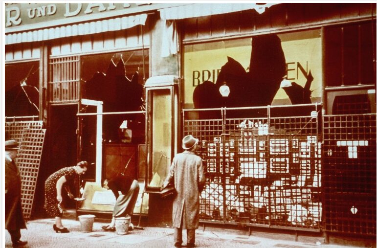 Am 9. und 10. November 1938 lösten die Nationalsozialisten eine Serie von Pogromen gegen die jüdische Bevölkerung aus. Diese fanden sowohl in Deutschland als auch in den kurz zuvor angegliederten Gebieten statt. In Anlehnung an die Glasscherben, die infolge des Vandalismus und der Zerstörung jüdischer Geschäfte, Synagogen und Häuser die Straßen übersäten, wurde dieses Ereignis als „Kristallnacht“ bezeichnet. Heute wird eher die Bezeichnung Pogromnacht verwendet.