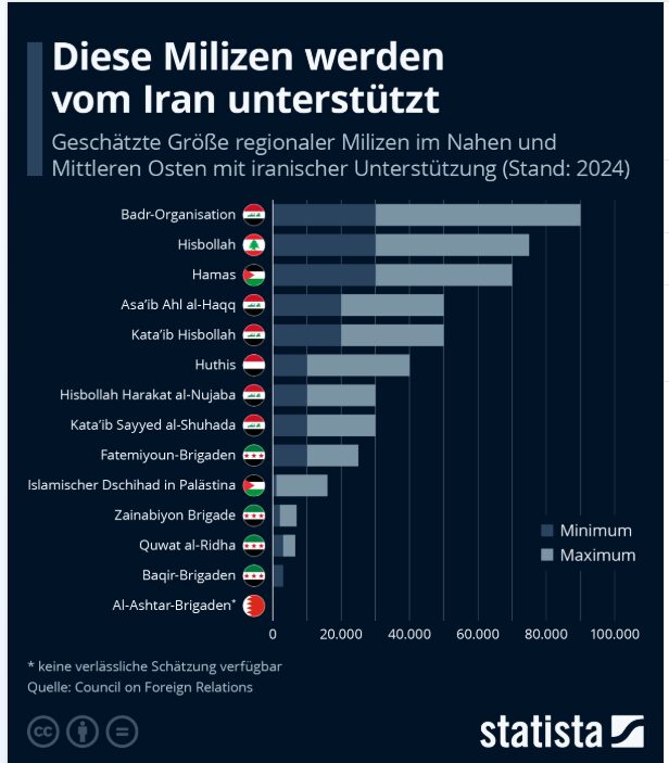 Der Iran betreibt im Nahen Ost ein Netzwerk von Milizen, die über die Quds‑Einheit mit Geld, Waffen und Ausbildung unterstützt wird, um regionalen Einfluss auszuweiten. Nach Schätzungen des US-Thinktanks Council on Foreign Relations liegen bei der personellen Größe der Milizen die Badr-Organisation (Irak), die Hisbollah (Libanon) und die Hamas (palästinensische Autonomiegebiete) mit mindestens 30.000 Mitgliedern an der Spitze. Auch im Jemen, dem Irak, in Syrien und Bahrain gibt es Milizen, die vom Iran unterstützt werden, wie die Grafik weiterhin zeigt.
