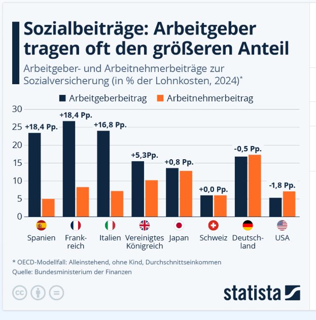 Das zeigt die Statista-Infografik mit OECD-Daten, die das Bundesfinanzministerium veröffentlicht hat, und die einen modellierten Ländervergleich für einen alleinstehenden und kinderlosen Arbeitnehmer mit Durchschnittseinkommen zeigen. Dies trifft etwa auf Spanien, Frankreich, Italien, das Vereinigte Königreich und in geringem Maße auch auf Japan zu.