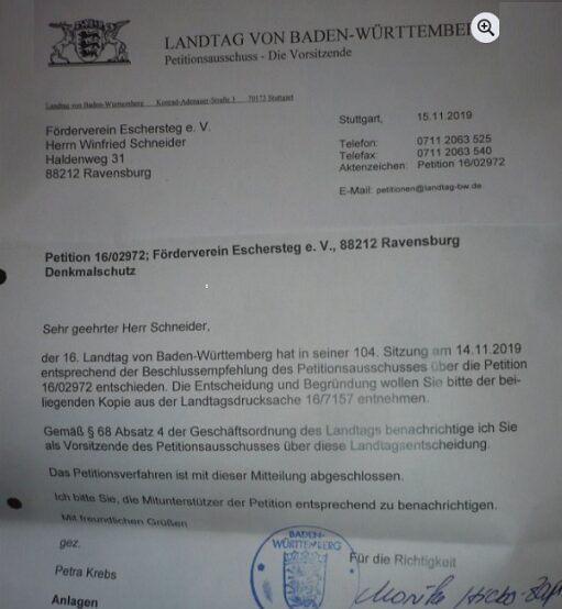 Mit diesem Schreiben im Zusammenhang der erwähnten Landesdrucksache von vor genau sechs Jahren, wurde die Petition zum "Wiederaufbau des Eschersteg" positiv entschieden.