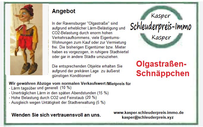 Ravensburg: Ist das Werbung? ... Satire? ... unglaublich? - "Schleuderpreis-Immo" bietet Wohnungen der "Olgastraße" zum halben Preis an !!