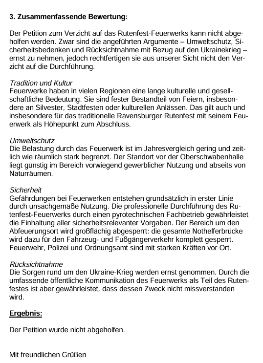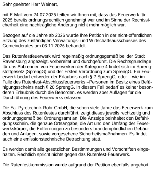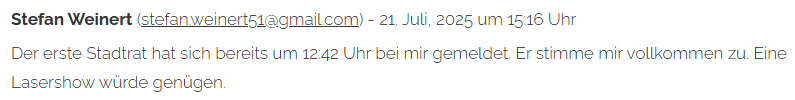 Als ich im Juli 2025 kurz vor dem hiesigen Fest die Petition auf meinem Blog veröffentlichte, schrieb mir ein Ravensburger Gemeinderat postwendend, dass er mir in Sachen Feuerwerk am Rutenfest völlig zustimme und dass eine Lasershow ihm genügen würde. Siehe folgend: