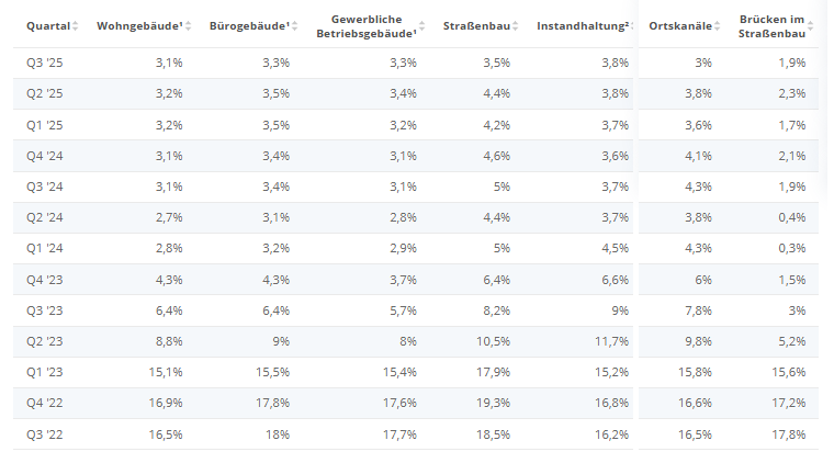 Entwicklung der Baupreise in Deutschland vom 3. Quartal 2022 bis zum 3. Quartal 2025