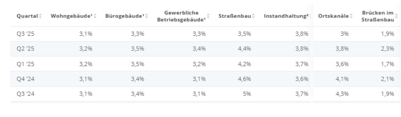 - Im dritten Quartal 2025 stieg der Preisindex für den Straßenbau in Deutschland um 3,5 Prozent gegenüber dem dritten Quartal 2024. Auch bei den weiteren Gebäudetypen stiegen die Preise im Vergleich zum Vorjahresquartal. (statista)