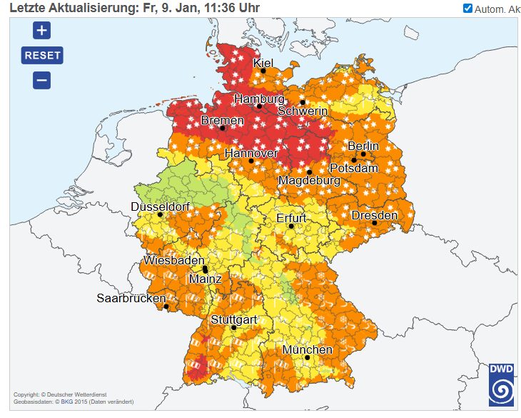 Infos: Lokale Warnungen des DWD und Verkehrsmeldungen beachten; bei Unklarheit zuhause bleiben.
