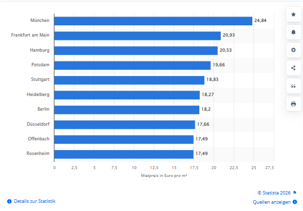 Städte mit den höchsten Mietpreisen für neu errichtete Wohnungen in Deutschland im 4. Quartal 2025