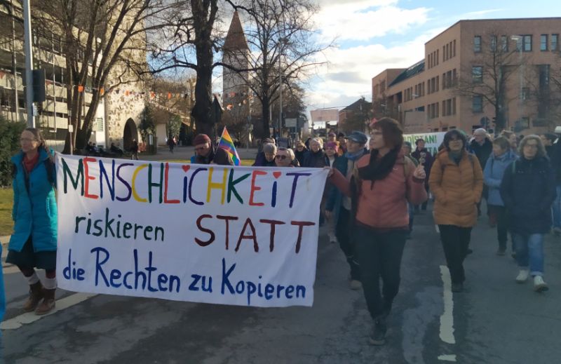 Bei strahlendem Sonnenschein bewegte sich der bunte Demonstrationszug vom Bahnhof durch die Innenstadt bis zum Marienplatz - Familien, Menschen mit Migrationsbiografie, Menschen im Rollstuhl und aus allen gesellschaftlichen Schichten, bunt und einträchtig miteinander, mit Schildern, Plakaten, singend und skandierend.