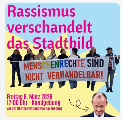 Vor diesem Hintergrund äußert eine Person aus dem Organisationsteam: „Unsere Kundgebung soll die CDU-Größen an die eigenen, propagierten Werte erinnern und sie mahnen, dem erstarkenden Rechtspopulismus ein menschliches Weltbild entgegenzusetzen, statt diese zu kopieren. Wir möchten deshalb den Besuch von Friedrich Merz in Ravensburg nicht unbeantwortet lassen.“