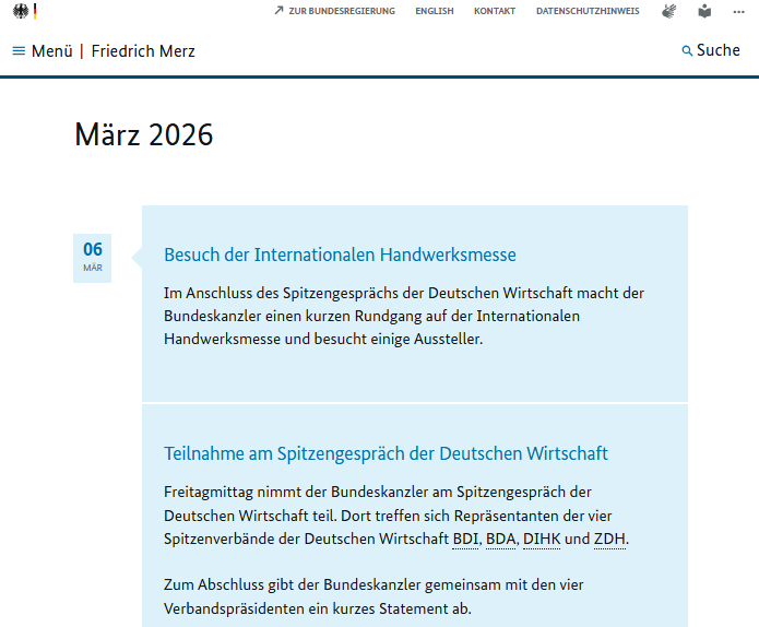 Der Terminkalender des Bundeskanzlers, gefunden unter https://www.bundeskanzler.de/bk-de/friedrich-merz/terminkalender-merz