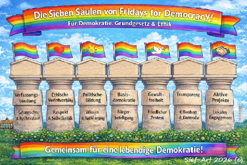 Last but not leastDemokratie ist kein Zustand, den man besitzt; sie ist eine Praxis, die gepflegt werden muss. Sie ist nicht statisch, sondern plastisch. Fridays for Democracy will diese Praxis erneuern — nicht als Ersatz für Parteien, sondern als Ergänzung: eine zivilgesellschaftliche Stimme, die auf Verfassung, Ethik und Gegenwartsbewusstsein baut.