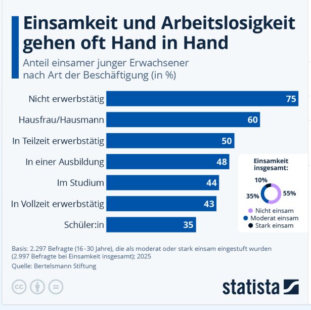Das Erleben von Einsamkeit tritt bei jungen Erwachsenen je nach ihrer Beschäftigungssituation unterschiedlich häufig auf. Das ist das Ergebnis einer Studie der Bertelsmann Stiftung. Junge Erwachsene, die nicht erwerbstätig sind, fühlen demnach sich besonders häufig einsam (75 Prozent). Bei Hausfrauen und Hausmännern treten Einsamkeitsempfindungen auch vergleichsweise häufig auf. Junge Menschen, die noch die Schule besuchen, sind es dagegen relativ selten (35 Prozent). Insgesamt beschreibt sich eine leichte Mehrheit von 55 Prozent der jungen Erwachsenen als nicht einsam, 35 Prozent sehen sich als moderat einsam und 10 Prozent als stark einsam.