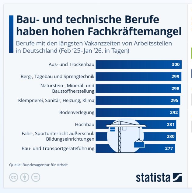 Der Fachkräftemangel in Deutschland entspannt sich spürbar. Das zeigt die Statista-Infografik mit Daten des ifo-Instituts. So liegt der Anteil der betroffenen Unternehmen Anfang 2026 mit 22,7 Prozent wieder unter dem Niveau von 2019. 2019 bewegte sich der Wert zwischen 29,8 Prozent und 32,9 Prozent, bevor er in der frühen Pandemiephase 2020 zunächst deutlich zurückging und sich anschließend mit der wirtschaftlichen Erholung rasch wieder nach oben bewegte – bis zum Höchststand von 49,7 Prozent in Q3 2022.
